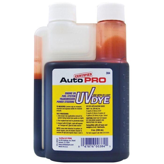 A/c treatment with uv dye. Application of the substance /. Certified a/c pro engine cooling systems uv dye is an engine coolant uv dye for leak detection. certified auto pro engine oil transmission power steering fuel system uv dye. One application of oil and fuel system uv leak detection dye. (s) of unknown acute toxicitynotelabeling elements found on this sds may be different from la. sds date of preparation: 07/14/2017 product use and uses advised against: Product use and uses advised against: sds date of preparation: